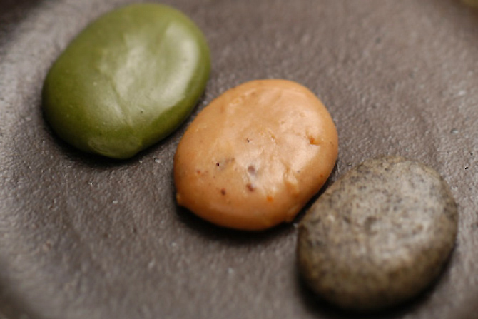1:くるみが入った、少し醤油の風味のある、茶色の甘い餅菓子(もちがし)