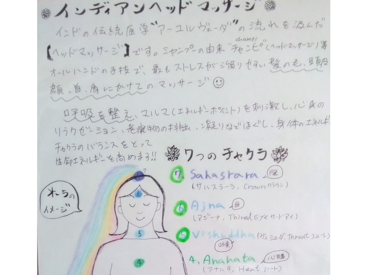 - ○着替えなし、椅子での髪、頭、顔、首、肩、腕にかけてのマッサージ ○じゃらん限定で体質診断付きで体質別オイルマッサージにグレードアップ ○髪の悩みや頭から肩の凝り、目の疲れや不眠症状にもお勧め!