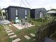 黒い壁と芝生のグリーンが目を引く、モダンな平屋の一軒家。