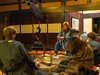 豪農古民家の刻を。いろり端の味を食す。太い梁がめぐるロビー周りは圧巻
