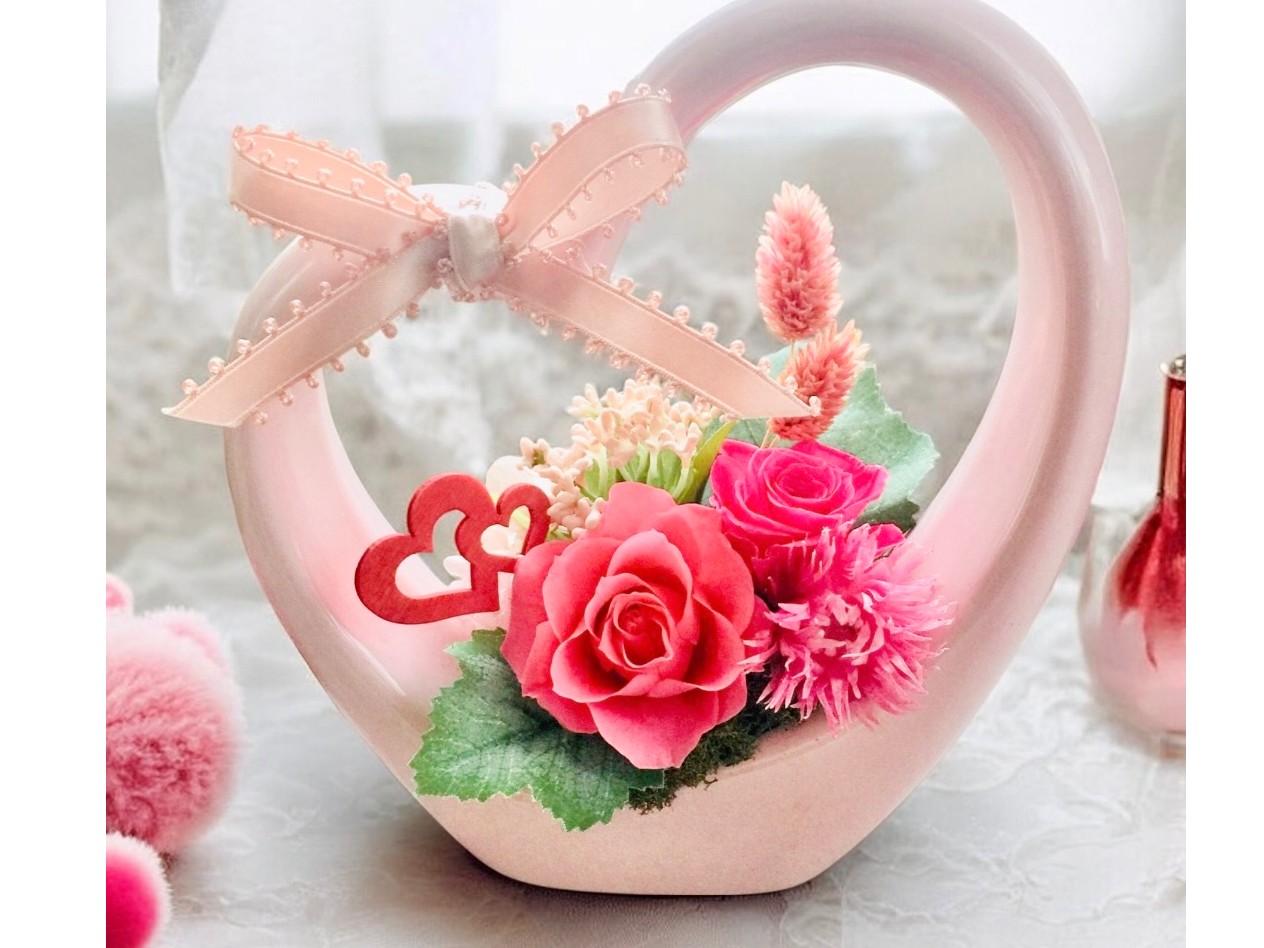 - ※2名様(カップル様お友達、親子様でご利用できます)でお得なプランです。 ハートの器は白いまたはピンクとなります。在庫のある方でのご提供です。長く思い出と共に咲き続けてくれるプリザーブドフラワーです