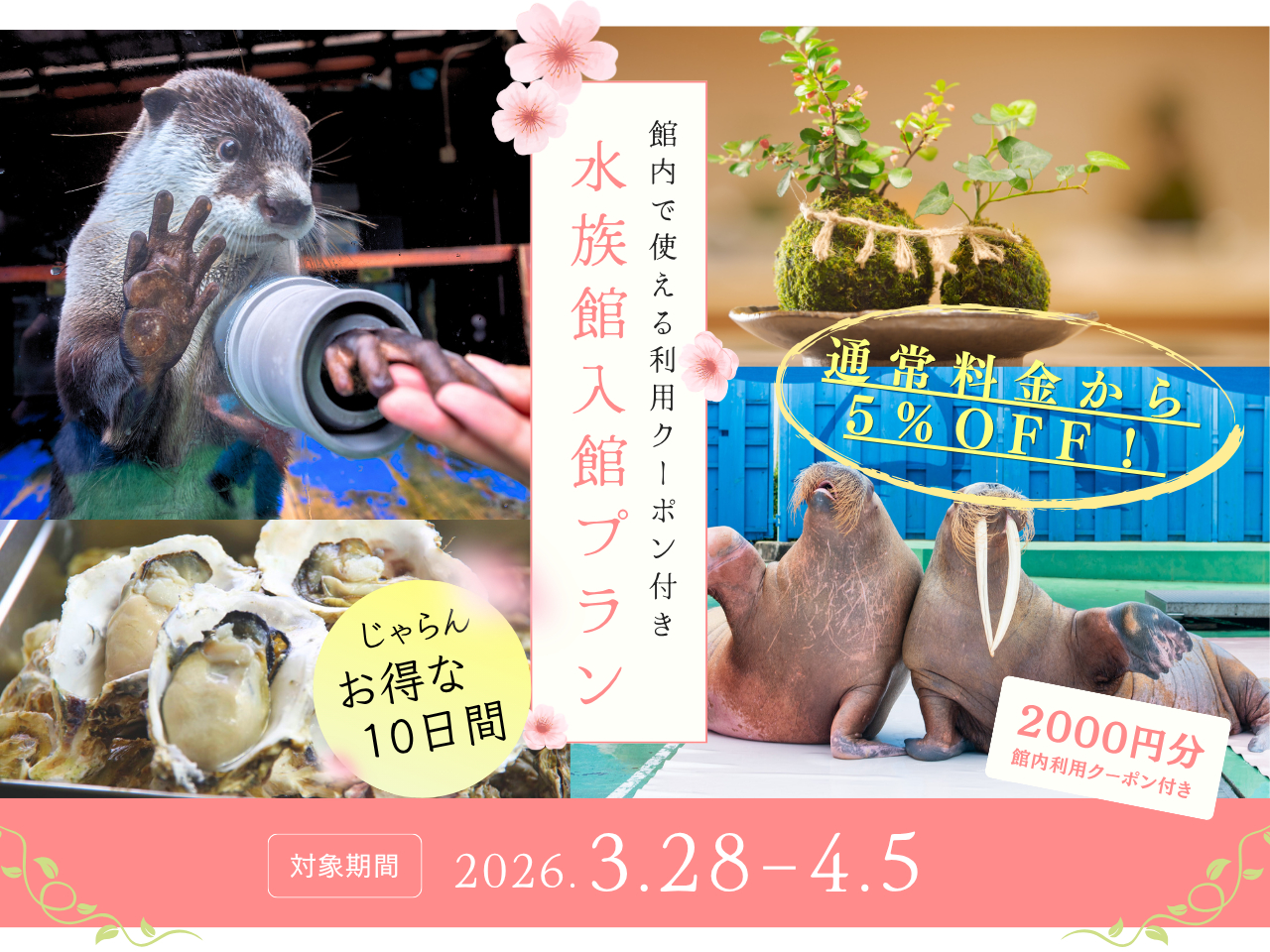 - 3歳以下無料!前日までご購入で◎最大300円引き◎ セイウチやアザラシ、カワウソなどの海獣、 お魚たちと距離感ゼロのふれあいイベント満載♪ じゃらんクーポン・ポイントでお得に予約!
