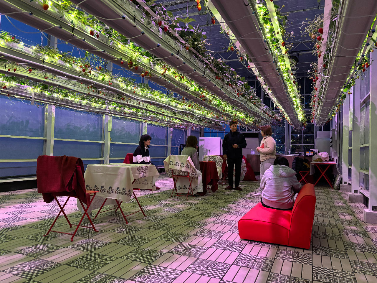 - 天井7.5m、苺が宙に浮かぶ苺空間を貸切。幻想的な3種ライトアップの空間で、夜にゆっくり苺狩りや自由な時間をお楽しみいただけます。吊り下がる苺と1,600球のLEDが、宙の星のように空間を照らします。