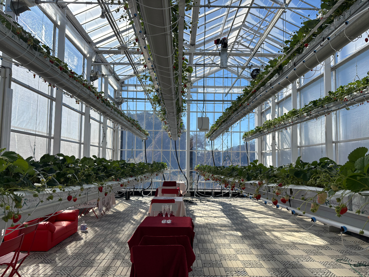 - 天井7.5m、苺が宙に浮かぶ苺空間で貸切苺狩り。苺ガターはお子様目線まで下げられます。苺シャンパン(ノンアルも有)、写真撮影付き。 藤沢の自然、田んぼ、木々を借景、ゆっくり自由な時間を過ごせます。