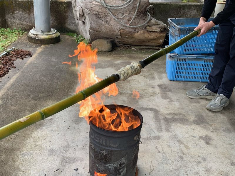 - 家庭にもある材料と竹を使ってバウムクーヘンを焼いてみましょう。焼きあがったバウムクーヘンにはくまモンの焼き印を押して、自分だけのオリジナルが作れます。体験後は水俣和紅茶でティータイム♪