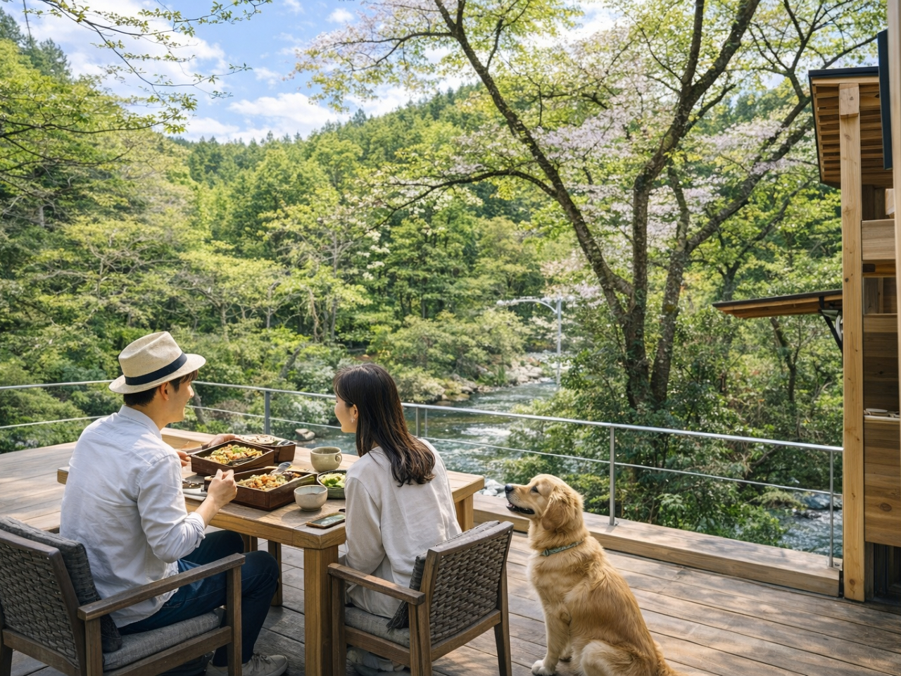 - 四万十川源流 愛犬とテラスランチ|鴨そば三段重