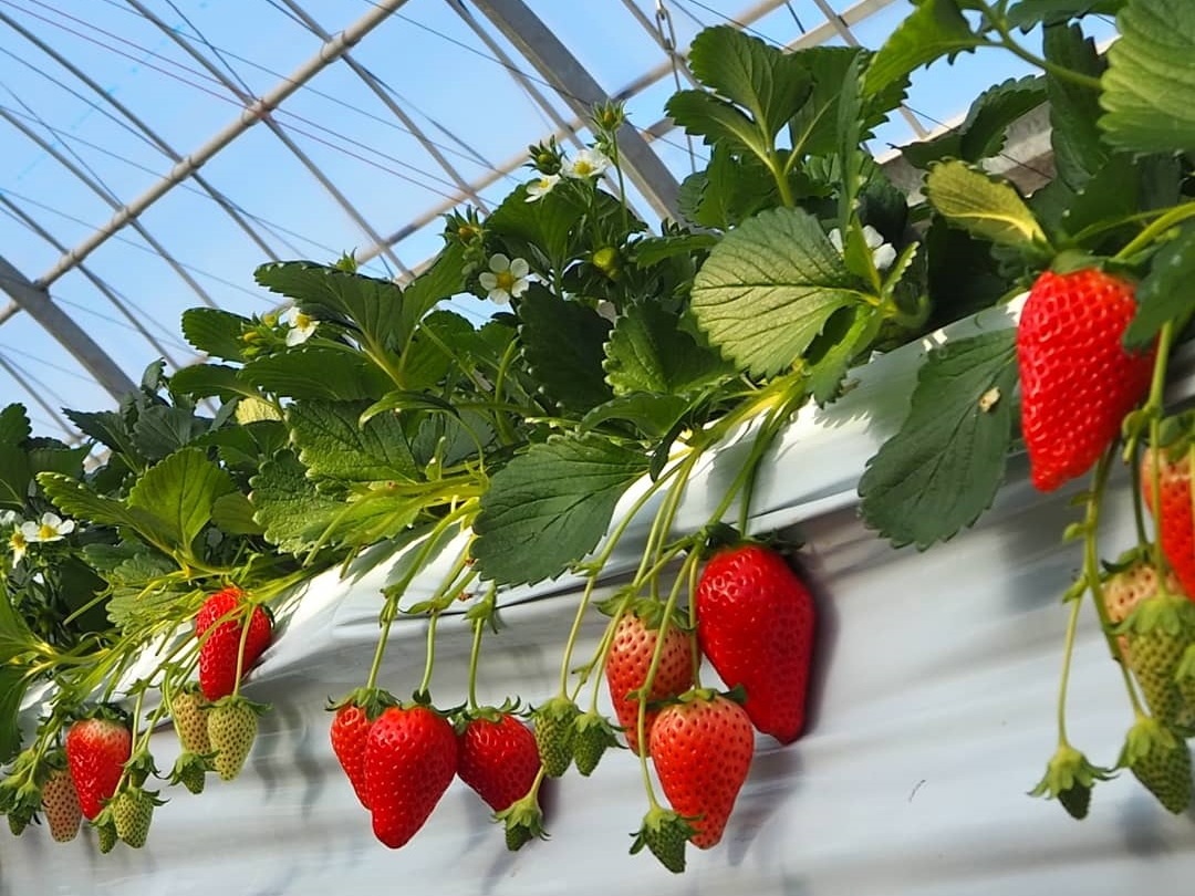 - ・2025年にできた新しいハウス ・4種類のいちごが食べ放題 ・床が白くて明るい ・章姫が半分以上、そのほかとちおとめ、紅ほっぺ、よつぼし