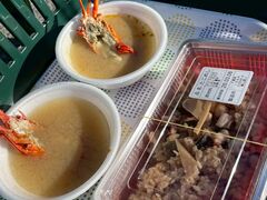 毎週日曜日に朝8時30分〜12時30分に朝市が開催されています。その場で熱々の伊勢海老のお味噌汁とタコの炊き込みご飯をいただきました。更に名産の魚介類を購入することも出来ます。また、9時から1枚200円で購入し、ビンゴ大会にも参加出来ます。我が家は朝市セットは当たりませんでしたが、ふぐの白子と鯵のさんが入り揚げ餃子が当たりました。当日は、風が強かったので、バーベキューは中止でした。