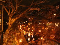 夕食後に「黒川温泉湯あかり」という風景を堪能しました。川沿いに点在する無数のランタンがたいへんきれいでした。