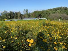 黄花コスモスは満開で迷路があります。早咲きコスモスもだいぶ咲いていました。天気が良くて上毛三山(赤城山、榛名山、妙義山)が一望です。申し込むと芋掘り体験もできるみたいです。