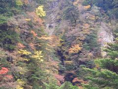 11月中旬の寸又峡の紅葉は、ちょうど見ごろでした。曇天の下でしたが、渓谷を作る山肌に点々と赤や黄色の木々が並び、白い岩と常緑樹の葉の色と混ざって、郷愁を感じる素朴な紅葉の景色でした。