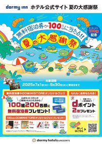 夏の大感謝祭プランとは、7月1日〜9月30日までのご宿泊のご予約をしていただくと、すべてのお客様にDポイント2倍、抽選で100組200名様に無料招待券のプレゼントまたは100名様にDOMINISUTOAオリジナルグッズ