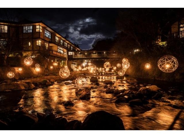 昔ながらの湯治場風情を色濃く残す黒川温泉の川端通りを、竹細工の灯篭があたたかく彩ります。放置竹林から地域の環境を守るため、竹の間伐・再生活動の一環として始まった、地元の人々の手作りによるライトアップイベントで、今では黒川温泉の冬の風物詩となっています。竹の明かりが揺らめく幻想的な温泉街のそぞろ歩きが楽しめます。