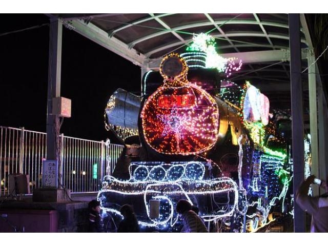 鉄道記念公園にイルミネーションが施され、志布志の街を彩ります。鉄道公園のSL、樹木を飾る14万球のイルミネーションは鹿児島県下最大級で、中でも電飾が壮大な蒸気機関車は見る人の目を楽しませます。大切な人とくぐると、幸せになれるといわれる光のアーチも登場します。