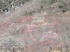 五分咲きとのことでしたが、満開の花もあって、十分きれいでした。山の斜面なので、下から上を見たり、上の方から見渡したり、いろいろな角度から楽しめました。平日でしたが、駅から10人乗りくらいの無料シャトルバスが出てました。満席になったら出発で、駅と会場を往復しているようです。前日、ホテルでチェックインの時、明日は梅の宴に行くと言ったら、宿泊者用の割引券と甘酒無料券がもらえて、ラッキーでした。会場に着いたとき、駅行きのシャトルバス乗り場に長い列ができていて時間がかかりそうだったので、帰りはタクシーを利用しました。2000円でした。駐車場は第4駐車場まで満車のようでした。