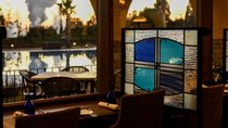 レストラン会場での夕暮れのひと時には、ステンドグラスが夕陽を浴びて美しく輝きます。