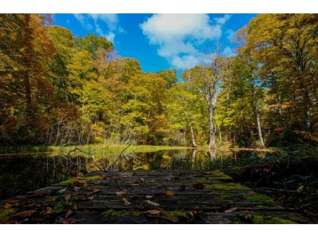 奥裾花自然園を包み込むブナの原生林は、例年10月になると鮮やかな黄金色に輝きます。全国でも数少ない、人の手が入っていない広大なブナ林が静けさの中に広がります。周辺の奥裾花渓谷でも、ツガやクロベの常緑樹やカエデなどの広葉樹が色づく錦繍の山々が望めるほか、奥裾花ダム湖から見る奥裾花大橋や、奥裾花大橋から見る奥裾花渓谷などもおすすめの紅葉スポットです。