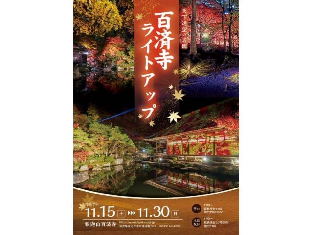 湖東三山最古の百済寺は、紅葉の名所として知られ、例年11月中旬になると鮮やかな紅葉で彩られます。特に錦繍の「天下遠望の名園」と「石垣参道」の紅葉は、「日本紅葉百選」の一つに選ばれており、池泉の水面に浮かぶ紅葉が、幽玄の世界へと誘います。見頃にあわせてライトアップも行われ、幻想的な雰囲気を楽しむことができます。如意輪観音半跏思惟像と聖観音像の拝観は、17時頃までとなります。