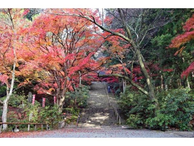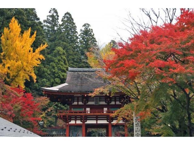 室生寺では、例年11月中旬になると、太鼓橋から本堂(潅頂堂)にかけて、モミジやイチョウなどが赤や黄色に色づき、秋ならではの美しい景色が広がります。歴史的建造物と、境内の紅葉との取り合わせも見事です。塔の左の道を登ると、御影堂(重要文化財)のある奥の院へと続きます。