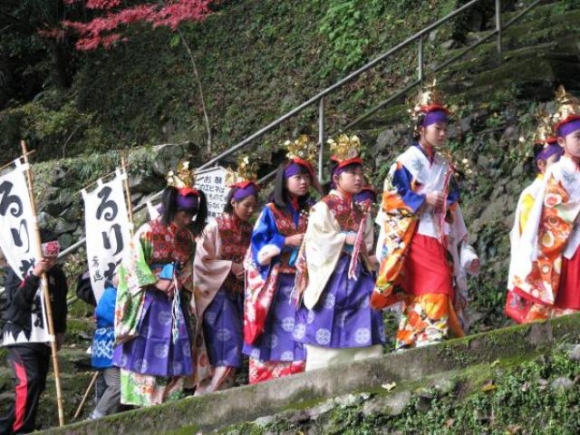 るり姫伝説が残る白滝付近で、るり姫の霊を供養するため、きらびやかな姫の衣装を纏った女児と花みこしを担いだ男児により、稚児行列が行われます。花みこしを滝つぼへ投下する伝統の行事も営まれ、この祭りの見どころとなっています。「もみじまつり」も開催され、白滝公園では17時から20時まで紅葉がライトアップされます。