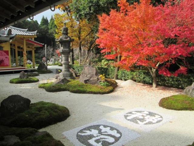 平成2年(1990年)開山の真言宗の寺院、不動山青隆寺では、例年11月下旬になると200本を超す木々が鮮やかに色づきます。約3万坪の敷地には僧侶が作庭した見事な日本庭園が広がり、35tの巨石をはじめとする多くの石や苔、数百年前の石燈籠が配され、紅葉と見事なコントラストを織り成します。標高300m地点にあるため、温暖な指宿では珍しい紅葉スポットとして知られます。カフェもあり、秋の景色を感じながら、ゆっくりと流れる時間を楽しむことができます。