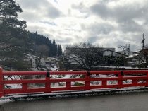 昼間のにぎやかさから一転、落ち着いた雰囲気になる夜の高山。静けさが深まる冬の夜、降り積もる雪の中にライトアップされた赤い中橋はとても幻想的。