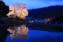 樹齢約400年の2本の巨木からなる壮大な桜。開花時にライトアップが施され、水田に鏡のように写りこむ姿が幻想的です。