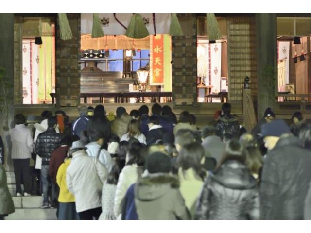 安産、子授け、子どもの守護神、水難除け、家内安全などのご利益で知られる久留米の水天宮は、正月三が日に約10万人の初詣参拝者で賑わいます。全国に鎮座する水天宮の総本宮で、大晦日の年越大祓と除夜祭に続き、元旦には歳旦祭が執行されます。