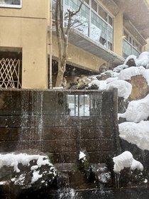 中庭の滝を望む2階軒下の岩場に、雨宿りならぬ『雪宿り』をするお猿さんです。