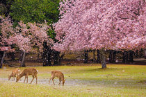 奈良公園では、満開の桜の下でのんびりと過ごす鹿たちの姿を見ることができ、