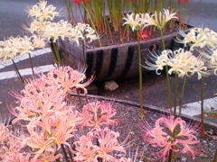 真っ赤な曼珠沙華の中に珍しい白〜クリーム色の曼珠沙華が咲いていて驚きましたが、案内所のすぐ近くにピンクの曼珠沙華が一輪咲いていてびっくりしました。来年も見れれば幸せです!