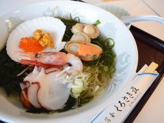 ウニ街道まつりのため、こちらへ海鮮ラーメンを食べに来ました。冷たいラーメンですが、さまざまな海の幸が入っており、食べ応えありでした!