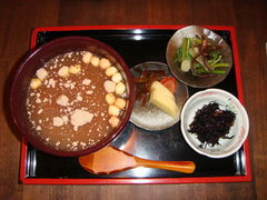 ぜんざい、葛きりなどの甘味、茶粥や梅そばなどが頂けます。