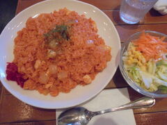 カフェとしては開店時間が正午というのは珍しい。10分前にはすでに数人並んでいる。店内はこじんまりとしている。厨房や壁の上の棚 にはジャズのLPがいっぱい。偶然、スピーカーの正面の席に。ボリュームがやや大きめだが、軽快なジャズに満足。品書きは辞書並の厚さのコルク板。オーダーしたのは人気のチキンライスセット。サラダ・ドリンク付きだ。チキンライスはボリュームあり。小さめにカットされたチキンと刻んだタマネギが炒めてあって、ややネチャっとしたケチャップ味のライスとの相性も抜群。イタリアンドレッシングがかかったサラダもいい味だ。コーヒーは自宅で飲むのと同じような味で、濃いめでコク・苦味がある。大好きなジャズを聴きながら、都会の喧騒を忘れるようなひとときを過ごせました。