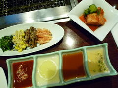 M三ダイニングビルディングの9階にある焼肉専門店です。入り口から店内の調度品や内装はシックな色調で統一。フックにかけたコートや上着は布で覆ってくれます。バッグ類にも専用の布カバーが ロースターは丸型もあるが、腰掛けた席は長方形。煙はほとんど広がらないので快適そのもの。メインの肉が出る前の前菜の種類が多い。ノンアルコールとともにいただく前菜は、舌だけでなく目も楽しませてくれます。吟味された肉はカルビやホルモン、海老など。時間を気にせずに、マイペースで焼けるので美味しさも倍増。焼肉の旨味を堪能できるお店です。