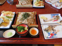 洞川温泉の通り沿いにある食堂でいろんなメニューがありましたが、鮎とアマゴの塩焼きと、天ざるを頼みました。塩焼きが早く来て食べ終わったころに天ざるが運ばれましたが、どれも美味しかったです。天ぷらも沢山あったのでお腹一杯にになりました。