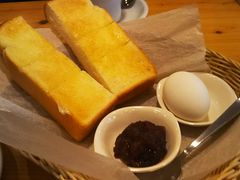 こちらではモーニングセットをいただきました。コーヒーを注文すると、トーストやゆでたまごなどついてくるお得なセットでした。