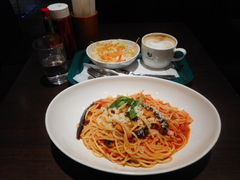 ナスとベーコンのトマトソース、サラダ、カフェラテ