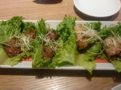 ビール、牛カルビと六白黒豚カルビの野菜巻き、海鮮チヂミを注文。