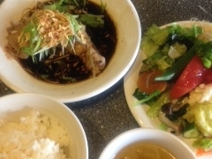 骨までポリポリと食べられる、蒸し鶏の醤油油でランチ。
