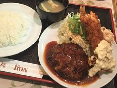 ハンバーグやエビフライ、コロッケ、唐揚げ、カキフライ、ヒレカツなどを組み合わせたメニューがあり、気分で食べたいものを選べます。