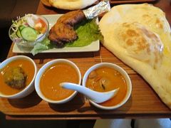 ナビで場所は判ったのですが、駐車場が探しても分からず、結局、お店の人に聞いてやっと判りました。初めて行く人は事前に調べていった方がいいと思います。たまには日本の料理でなくてもということで、千里近くで見つけたアジアン料理店でしたが、思ったより日本人向きの味で、辛さはほとんどありません。もっと刺激的な辛さを想像していたので少し期待外れでしたが、味は美味しく、カレー2種とトムヤムスープ、サラダ、タンドリーチキンとナン、チャイのセットでした。