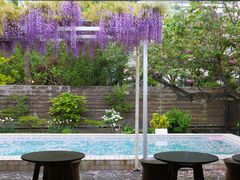 雨のせいか、いつもよりお客さんは少なめでした。見頃になった藤とプールに浮かぶ八重桜を眺めながら頂くコーヒーは格別。