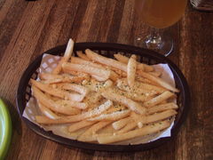 フレンチフライとチリビーンズバーガーをオーダーしましたが、バーガーにもフレンチフライが付くと教えてくれ、ガーリック&チーズのポテトに変更。テーブルの上にはハインツのケチャップとマスタードがドーンと置いてあり、ポテトにたっぷり付けながら、大人はビールも楽しめました。