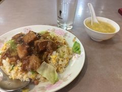 レタス炒飯のうえに牛バラが乗ったガッツリ系の一品。