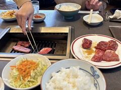 米兵相手なのか基地近くは焼肉屋さんがとても多かったです。行く時に前を通って一番人が多かった千成さんに入店。地元の人や会社勤務の人達でいっぱいの繁盛店です。狭い階段で2階に通されると、とても広い板の間の座敷。机毎の間隔も広くとってあり、とてもゆったりと出来ました。妻と2人でランチF定食(カルビとハラミ)1280円(当時)を2つとレバニラ炒め950円を1つ注文。これがとても美味しい。お腹が減っていたこともあり、人生最高に美味しく感じました。タレも美味しいので販売して欲しいです。価格もお安いのでビールも頂きながらとても良い気分。遠路遥々厚木基地祭に来た筈でしたが、電車賃を掛けてでもこのお店で焼肉を食べられて良かったです。