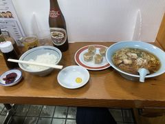 お盆明け、平日に、行きました。姫路城を見学後、雨の中、さまよい、美味しそうな町中華屋さんを発見!シュウマイ、焼きシュウマイが、名物らしいです。12時前に着いたのですが、ほぼ満席。わたしは、待たずにすみましたが、すぐに、満席状態になりました。迷わず、シュウマイランチとびん麦酒をオーダー。ラーメンとシュウマイとライスorごまだんごのセットです。750円なり。麦酒のあと、わりと早く提供されました。まずは、ラーメン。スープは、煮干しだしの懐かしい味。麺は、細麺、焼豚は、小さ目でしたが、美味しかったです。さて、シュウマイは、手作り感満載のもちもち食感、食べたことのない味わいでした。会計時、お持ち帰りをしてる方もたくさんいました。ぜひ、ご賞味あれ。ご飯も美味しかったけど、隣の方が頼んだごまだんごをみて、次は、ごまだんごだなと決意しました。会計は、おばあちゃんが丁寧に対応してくださいました。外に出る前に、日替わりのサンプルを見て、また、機会があれば、訪れたいと思いました。