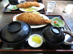 店内は昔ながらの食堂のような雰囲気のお店で家族連れで食事に来ているお客さんでこの時は目立ってました。特大わらじフライ1700円にプラス定食セット350円を付けるとご飯と赤だしの味噌汁が付きます。