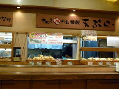 店内 厨房の前にトッピングの天ぷらなどが並ぶ