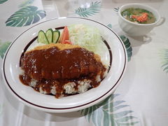 ご飯にカツを乗せて、デミグラスソースをかけたものでした。